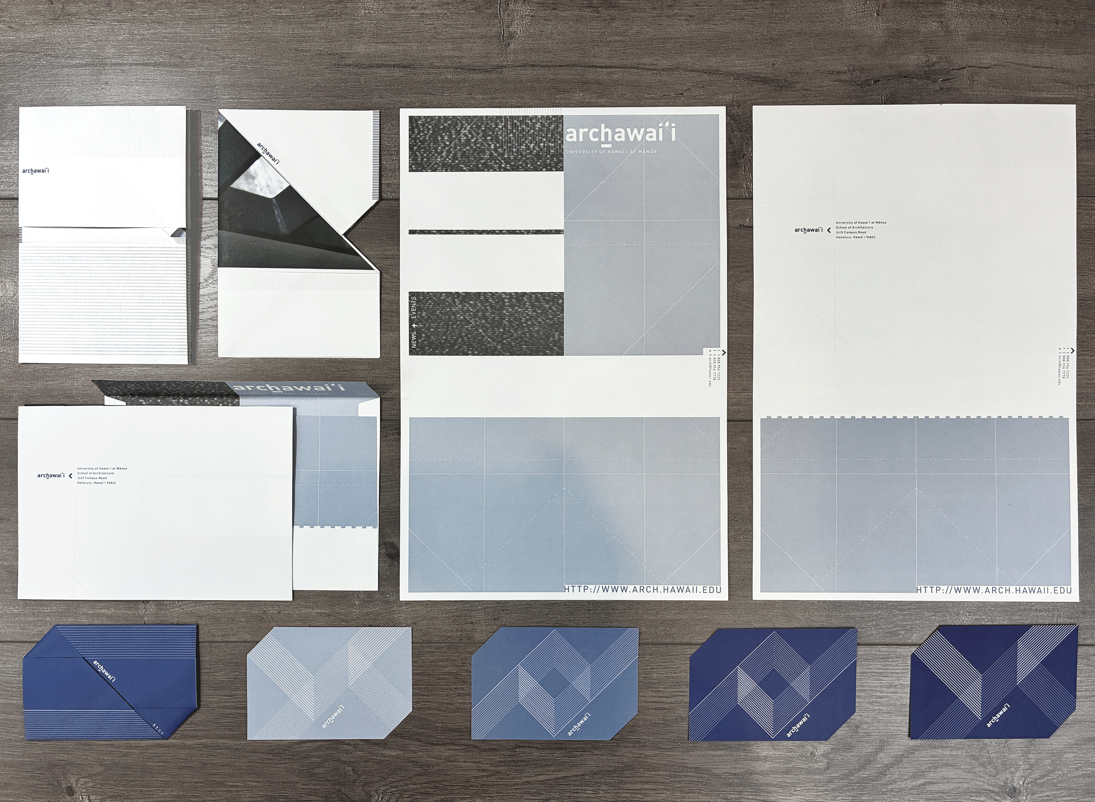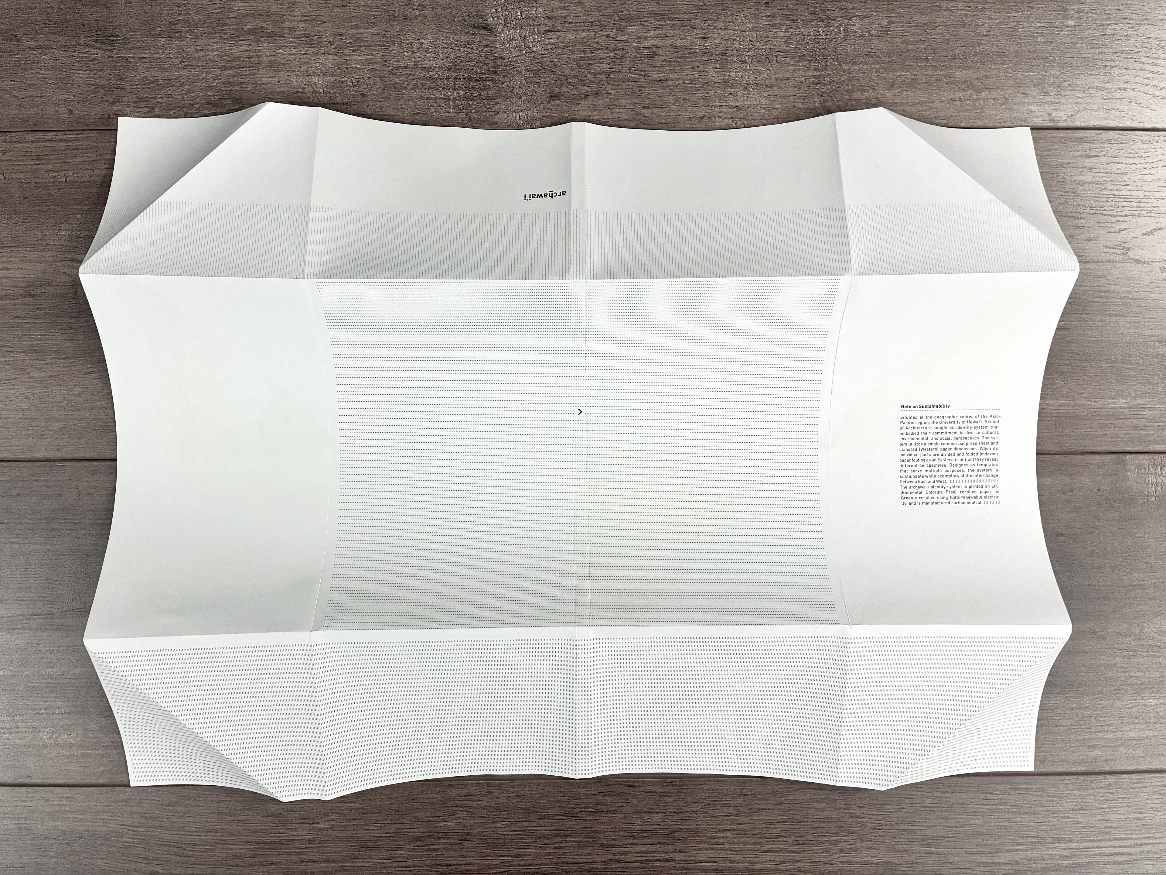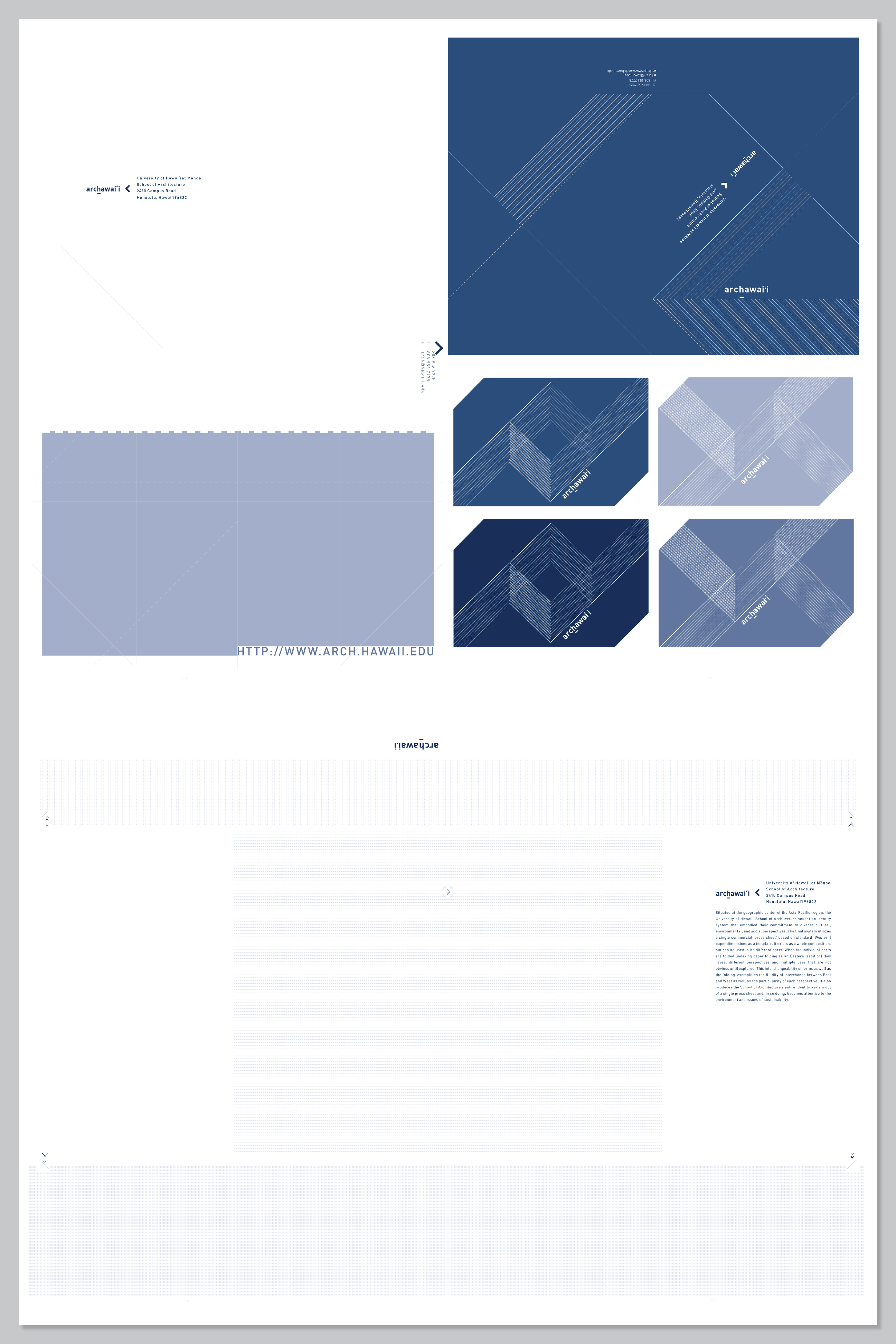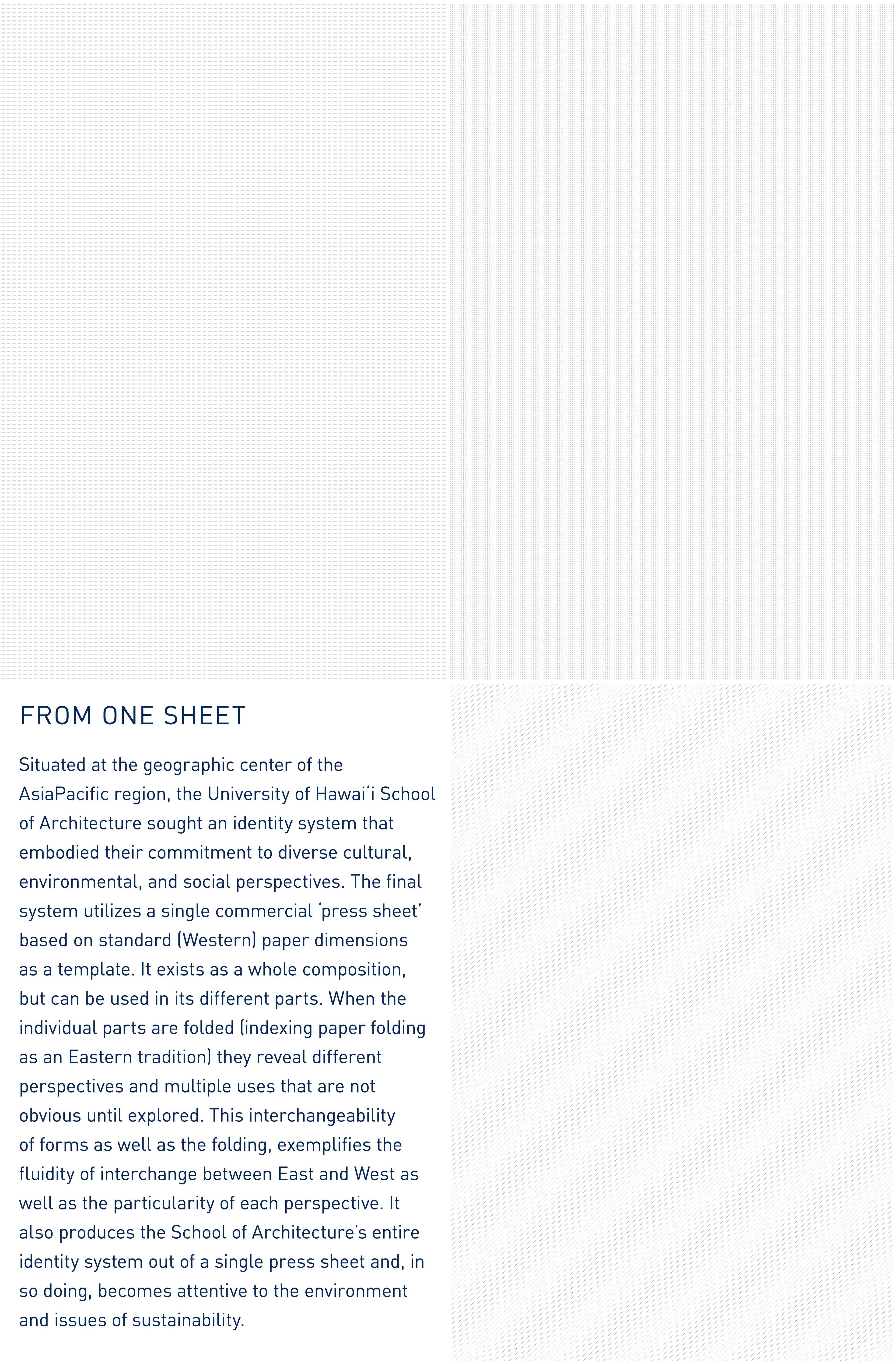 This identity system for the University of Hawaiʻi School of Architecture utilizes a single commercial press sheet divided into 8.5×11, 11×17, + 17×22 as a template that can be used interchangeably front and back. When the individual parts are folded (indexing paper folding as an Eastern tradition) they reveal different perspectives and multiple uses that are not obvious until explored. This interchangeability of forms as well as the folding, exemplifies the fluidity of interchange between East and West, and becomes attentive to the environment and issues of sustainability.