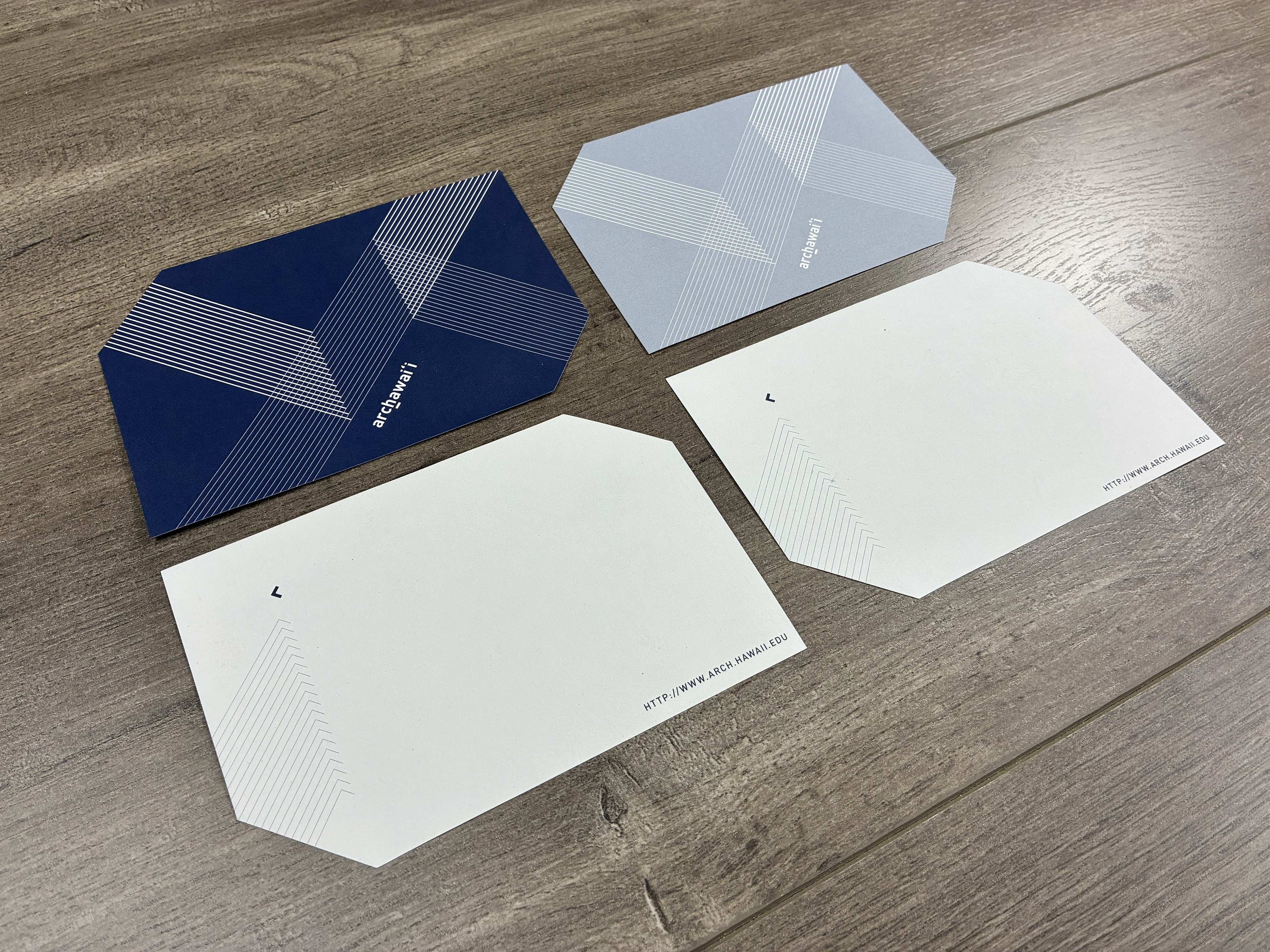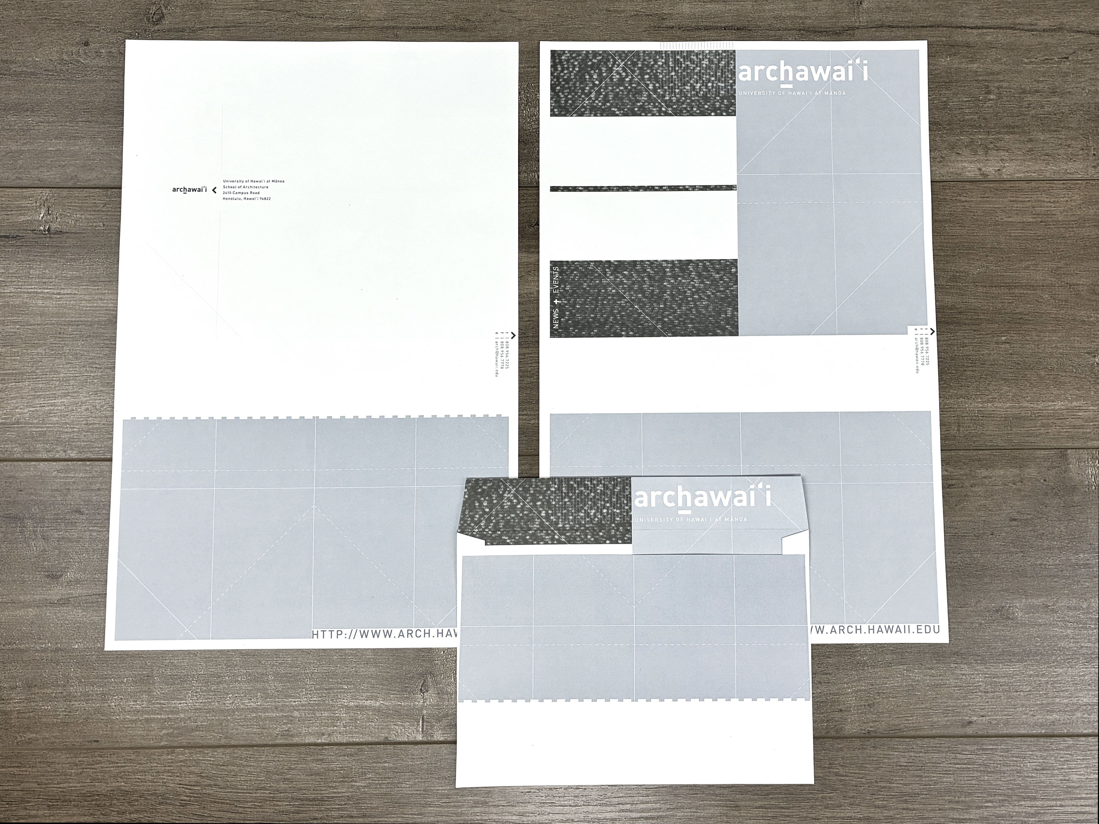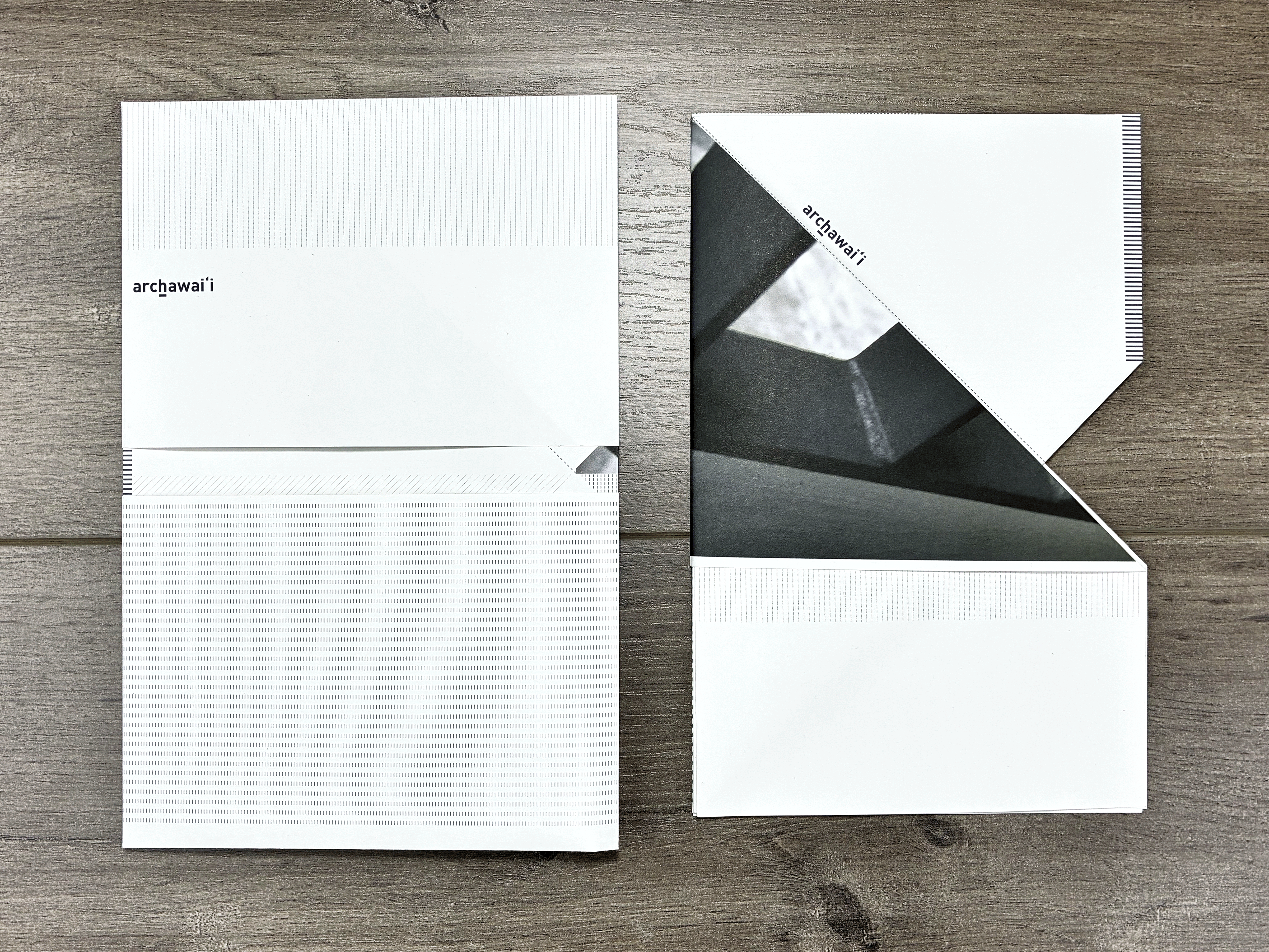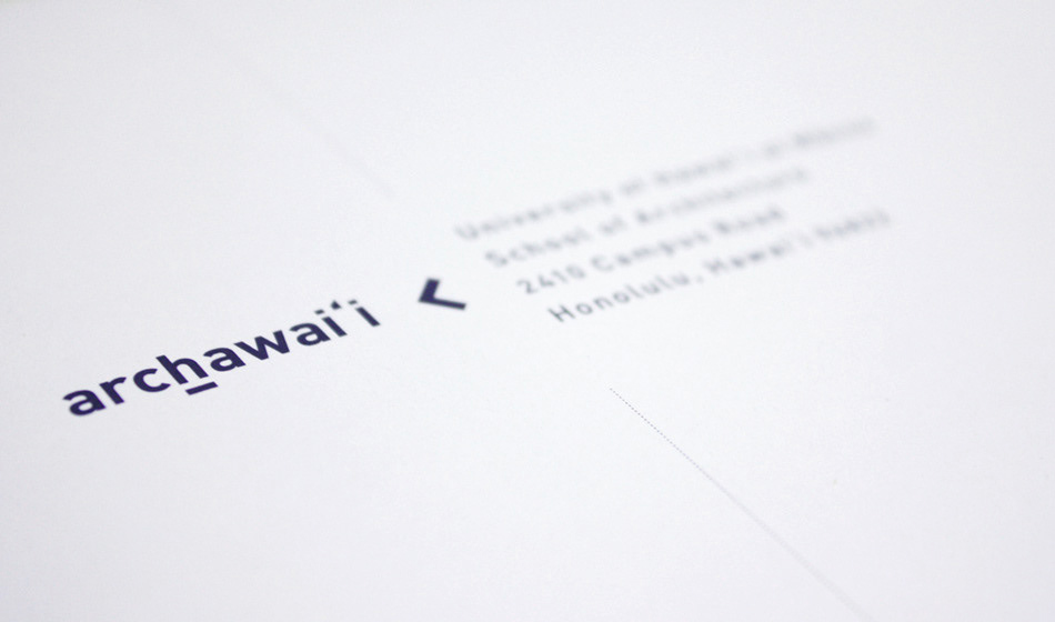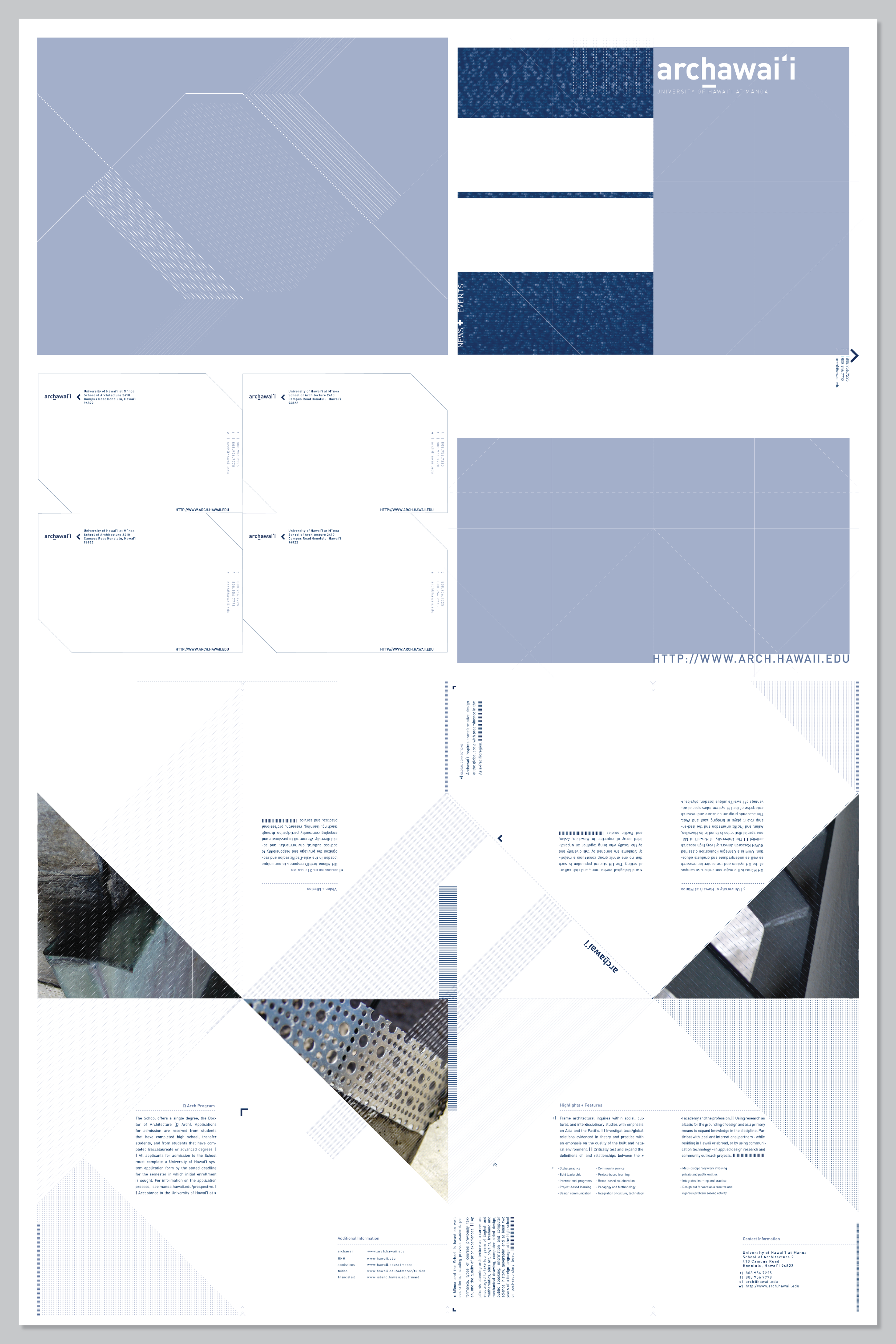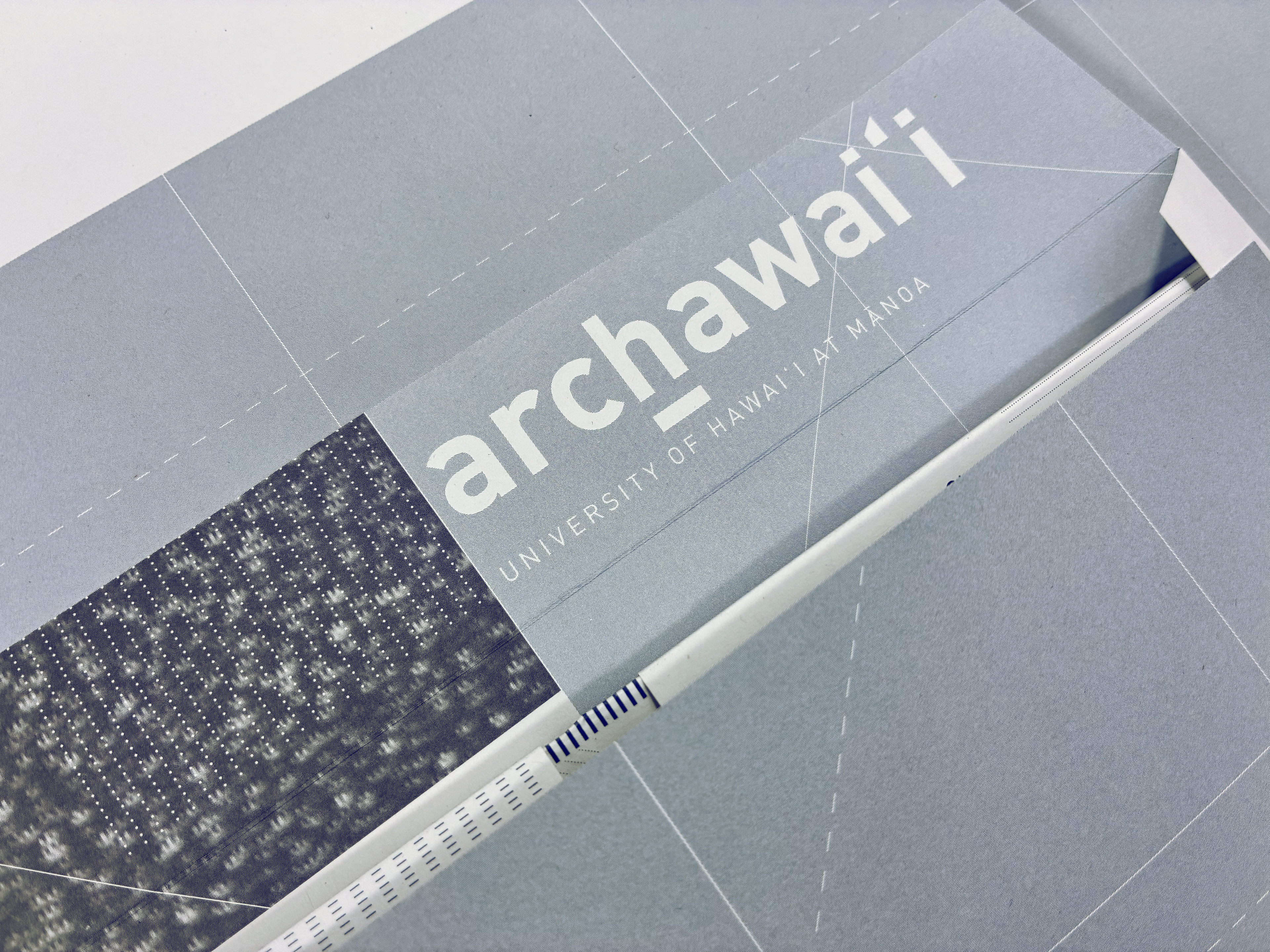 This identity system for the University of Hawaiʻi School of Architecture utilizes a single commercial press sheet divided into 8.5×11, 11×17, + 17×22 as a template that can be used interchangeably front and back. When the individual parts are folded (indexing paper folding as an Eastern tradition) they reveal different perspectives and multiple uses that are not obvious until explored. This interchangeability of forms as well as the folding, exemplifies the fluidity of interchange between East and West, and becomes attentive to the environment and issues of sustainability.