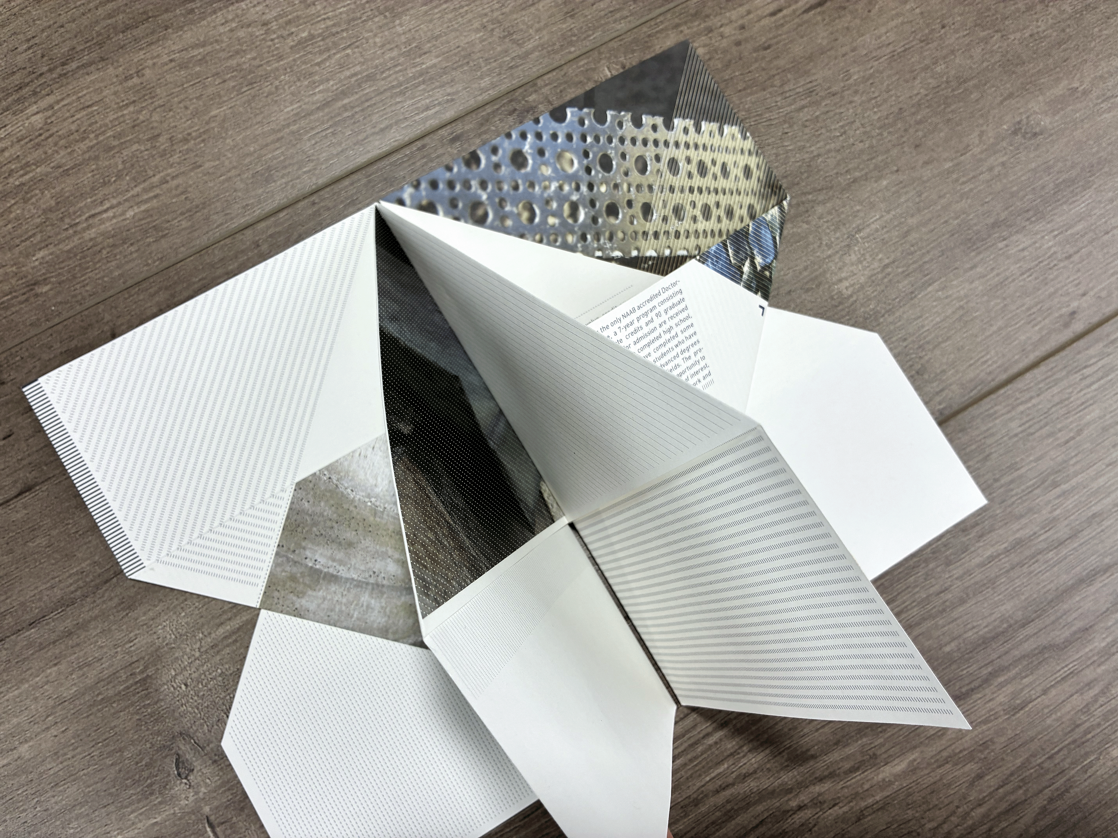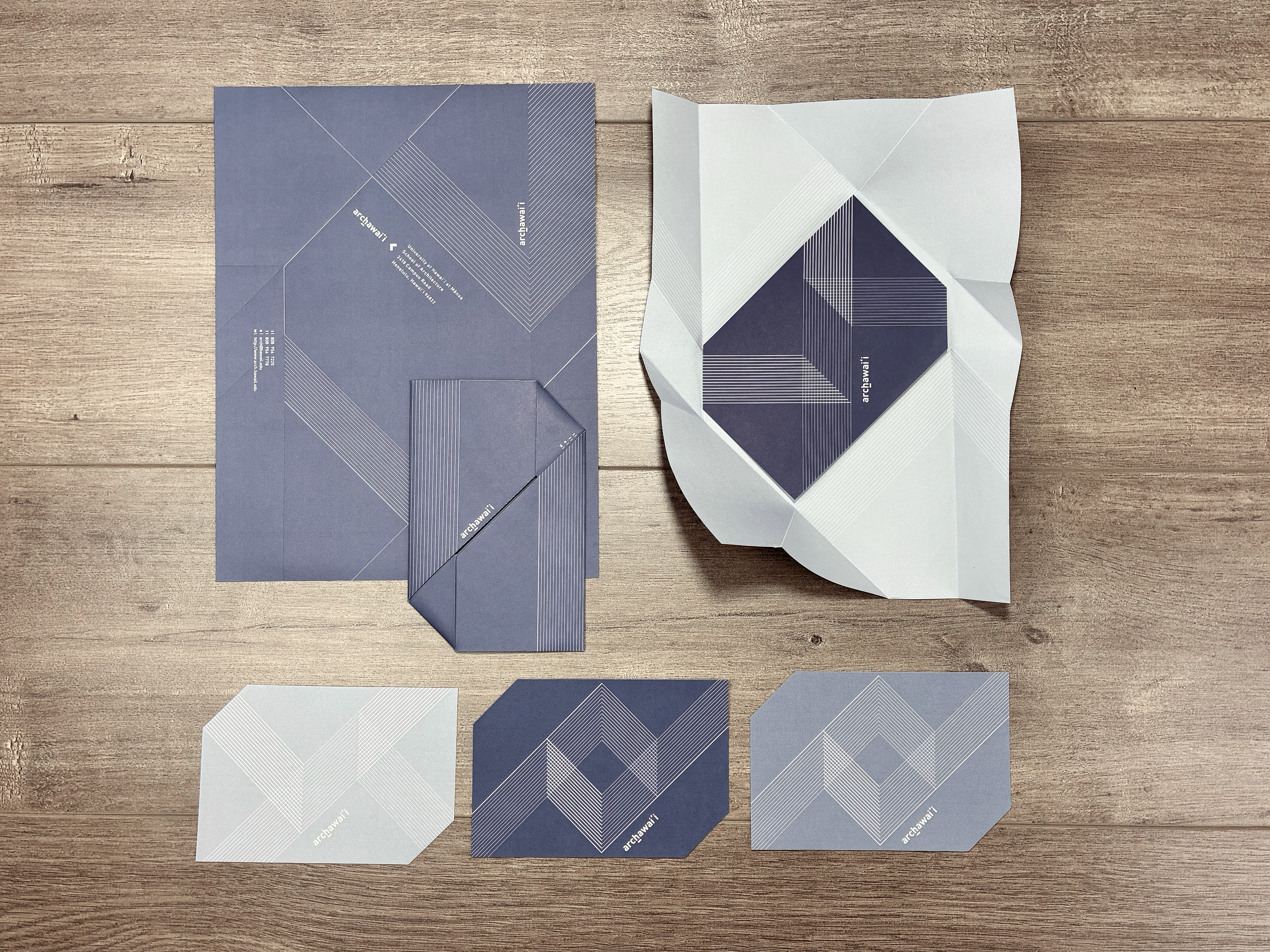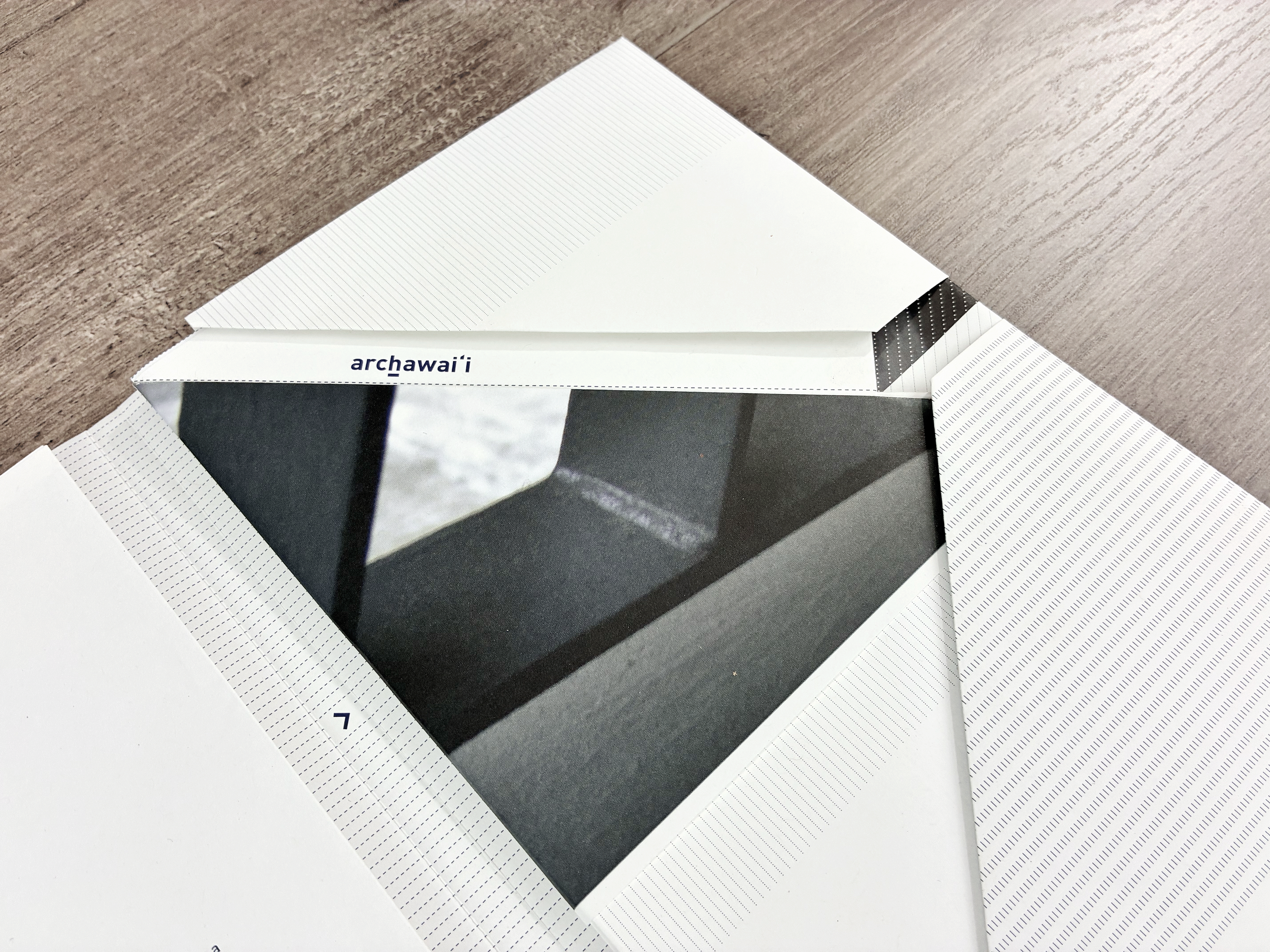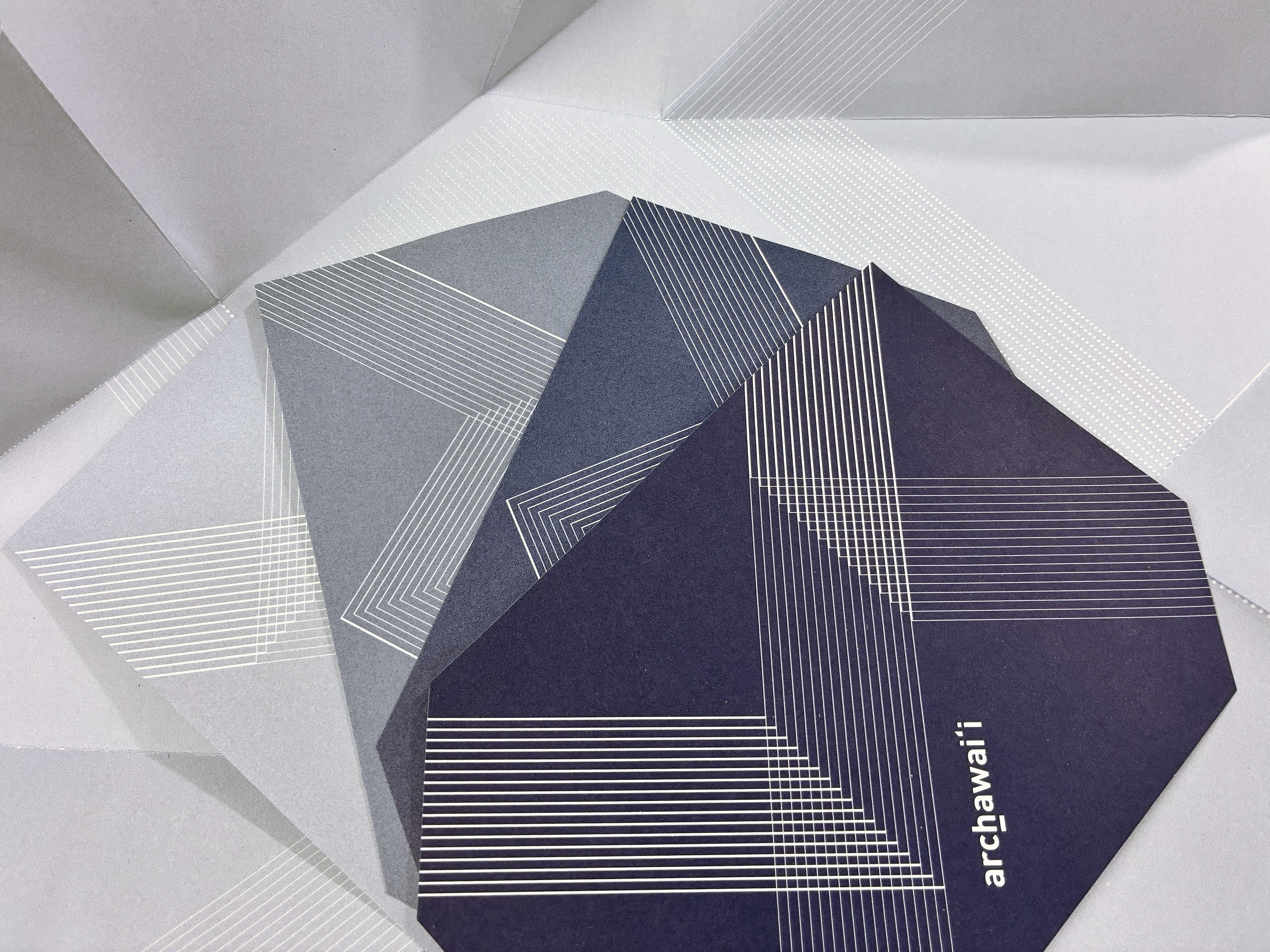 This identity system for the University of Hawaiʻi School of Architecture utilizes a single commercial press sheet divided into 8.5×11, 11×17, + 17×22 as a template that can be used interchangeably front and back. When the individual parts are folded (indexing paper folding as an Eastern tradition) they reveal different perspectives and multiple uses that are not obvious until explored. This interchangeability of forms as well as the folding, exemplifies the fluidity of interchange between East and West, and becomes attentive to the environment and issues of sustainability.