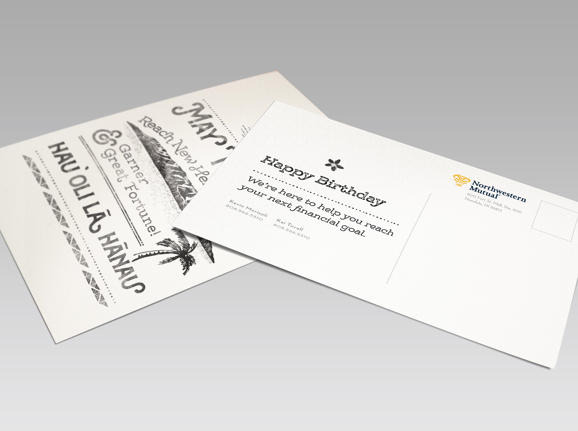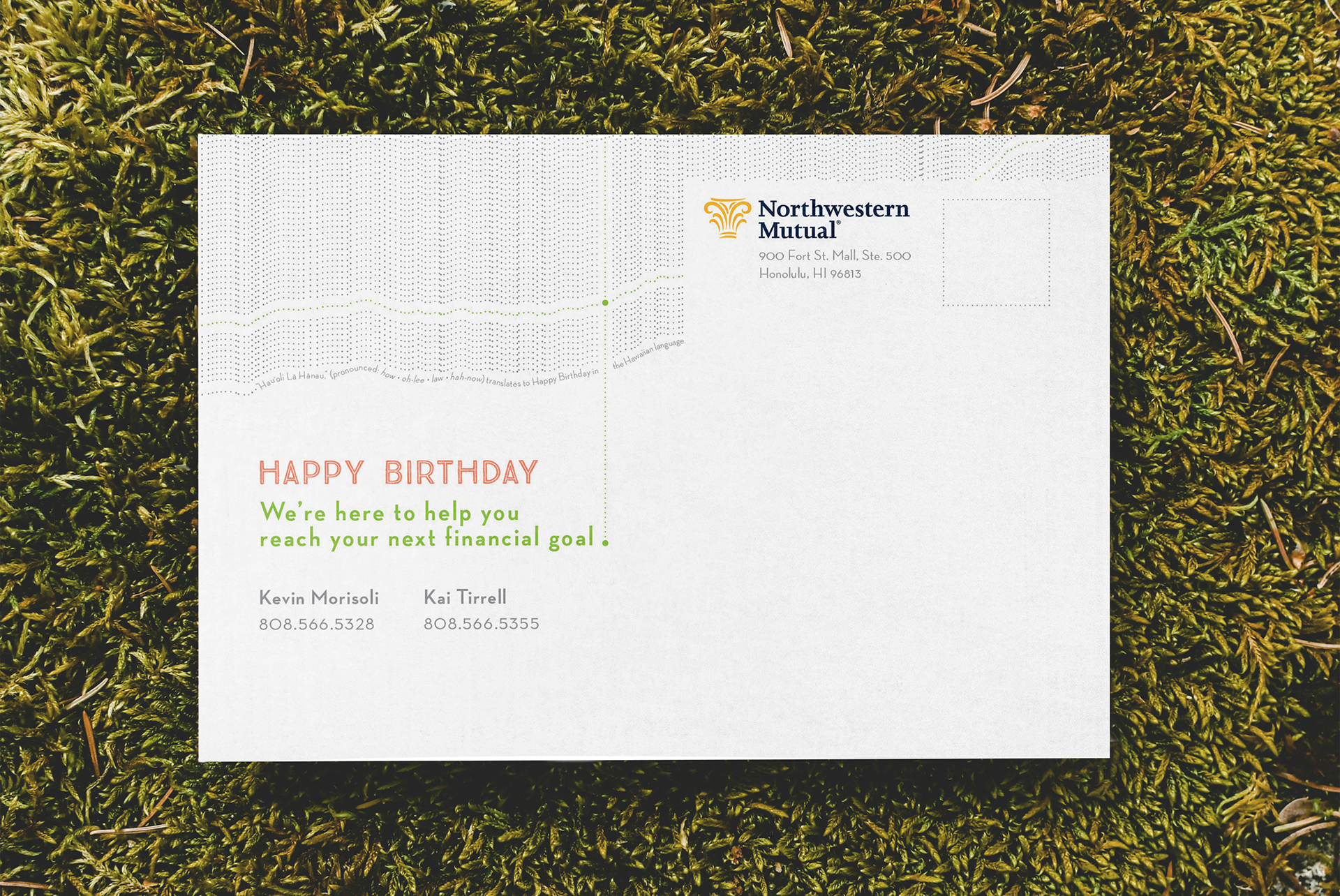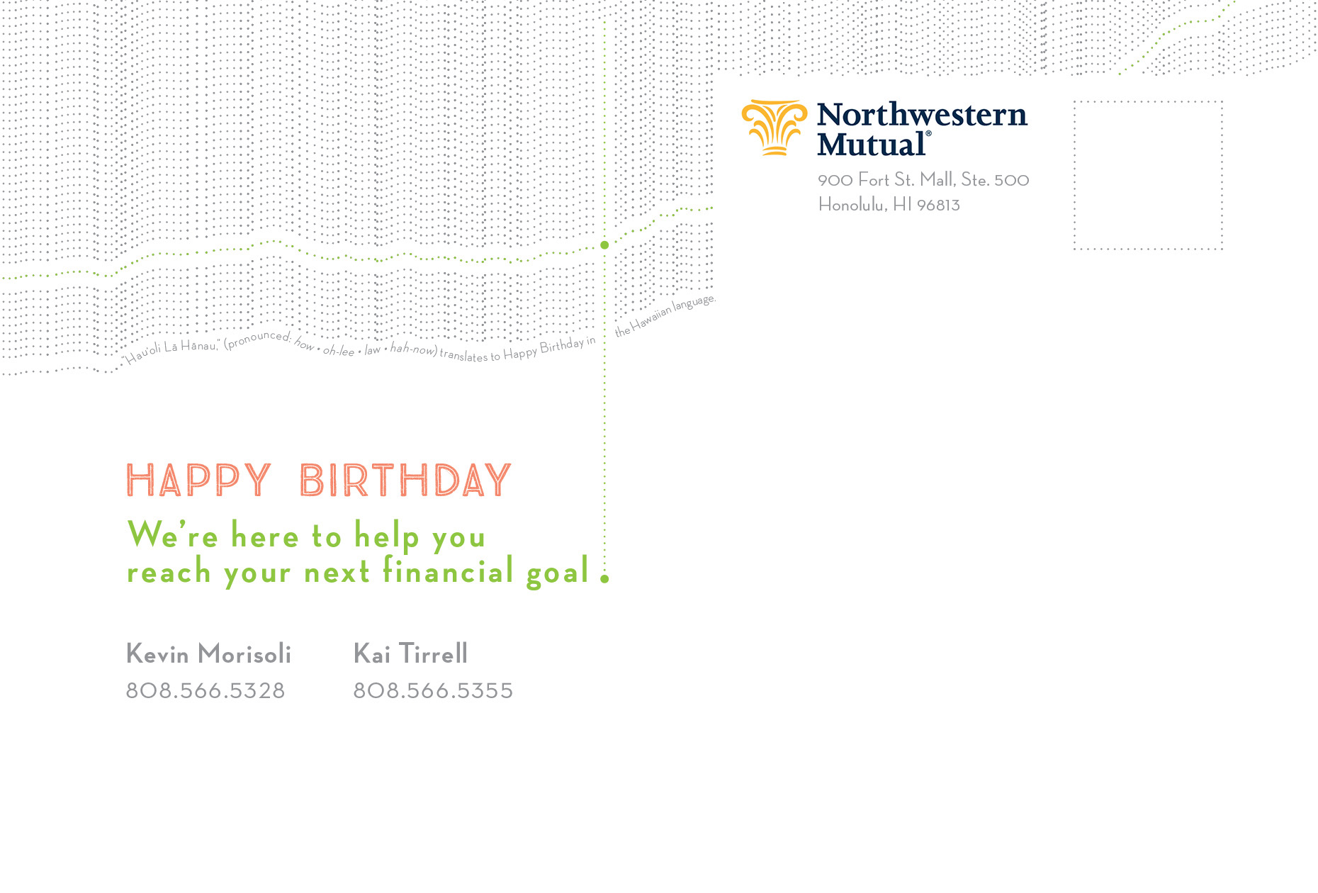 A client retention birthday mailer for the Northwestern Mutual Honolulu office. The birthday greeting is presented in the Hawaiian language, over a backdrop of the iconic landmark Diamond Head. The crater’s edge is echoed in a pattern above, which creates a design reminiscent of a financial line graph, to imply the prospect of financial growth. On the reverse side the pattern repeats with additional distinct elements—a subtext on translation, as well as link between the visual metaphor and ad copy.