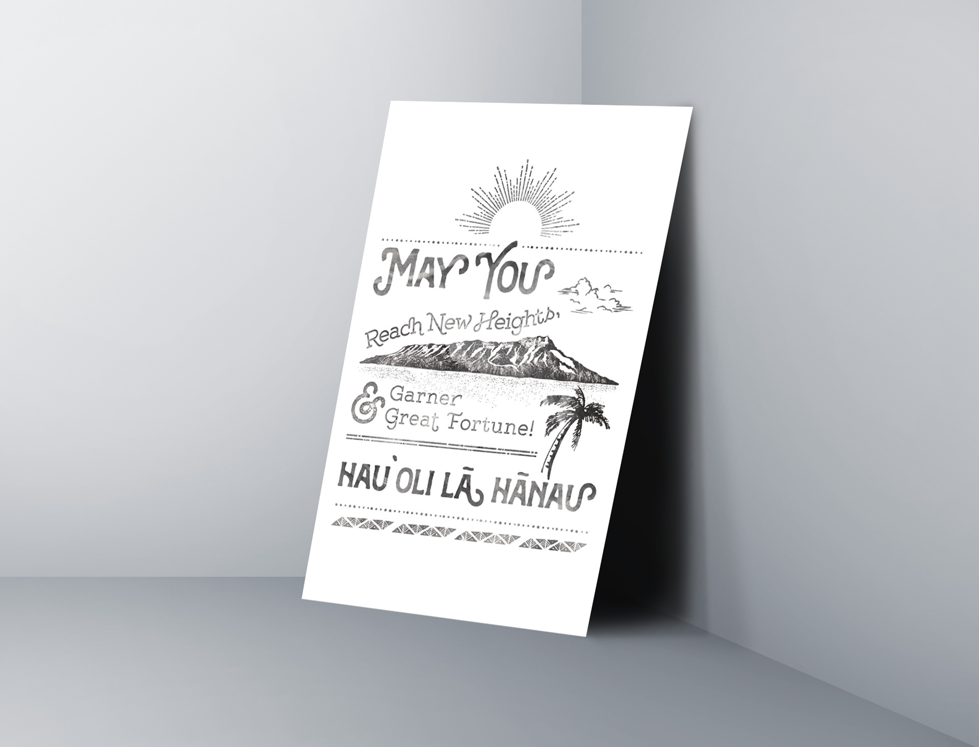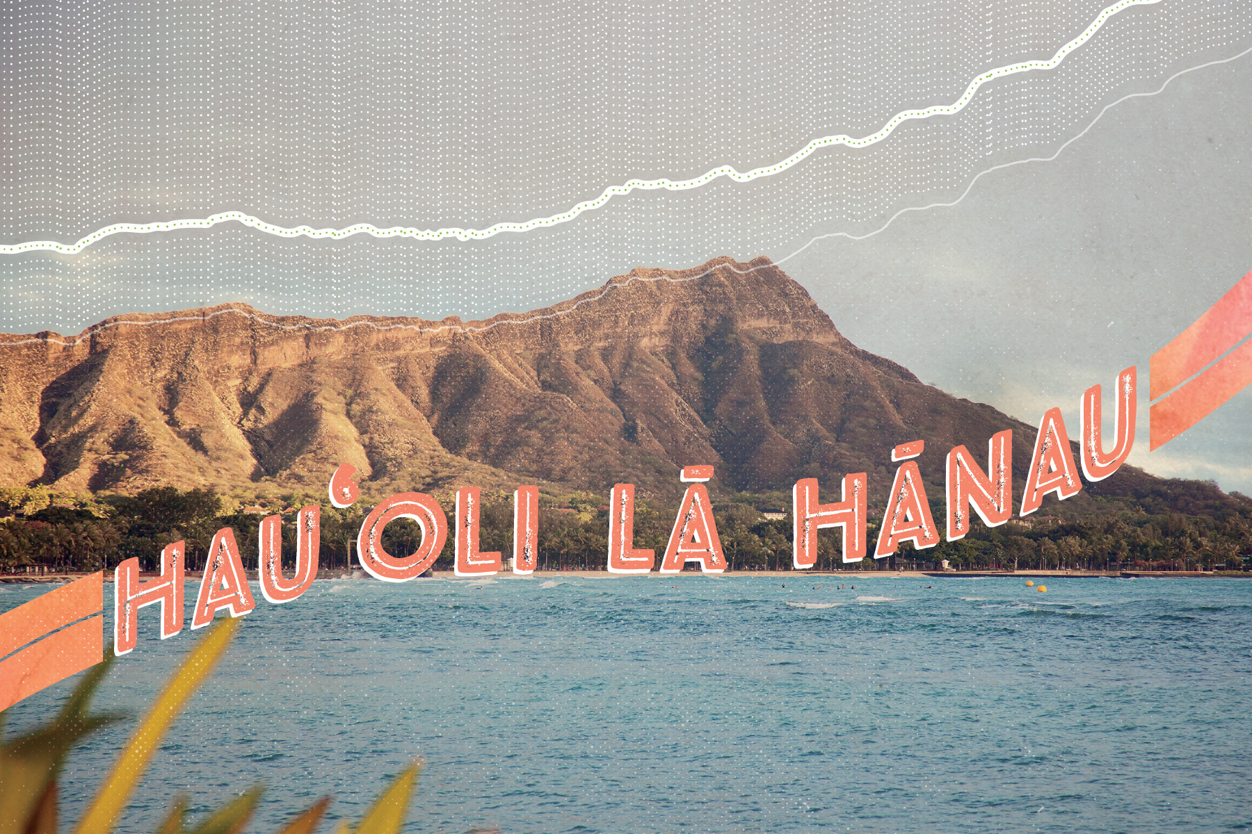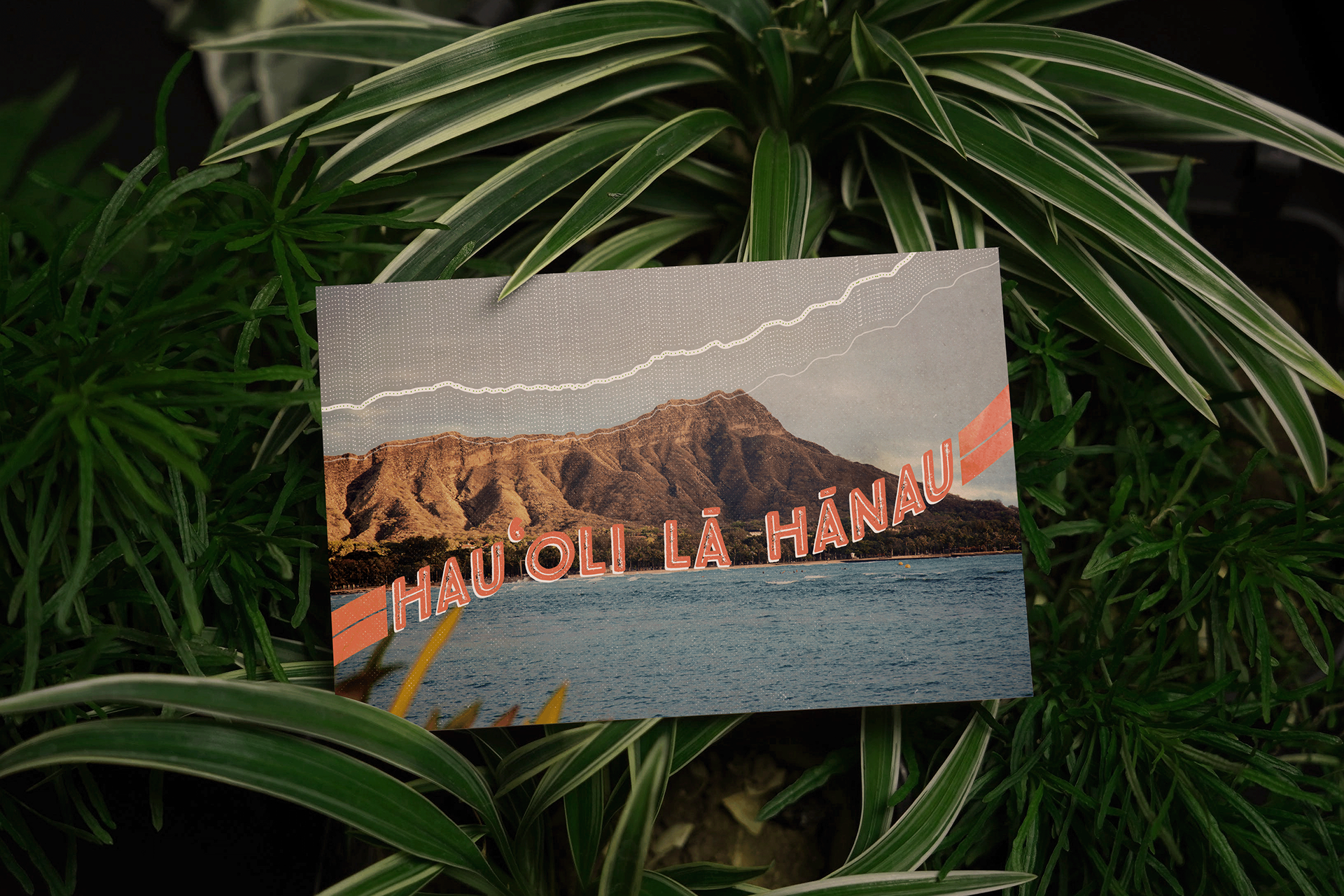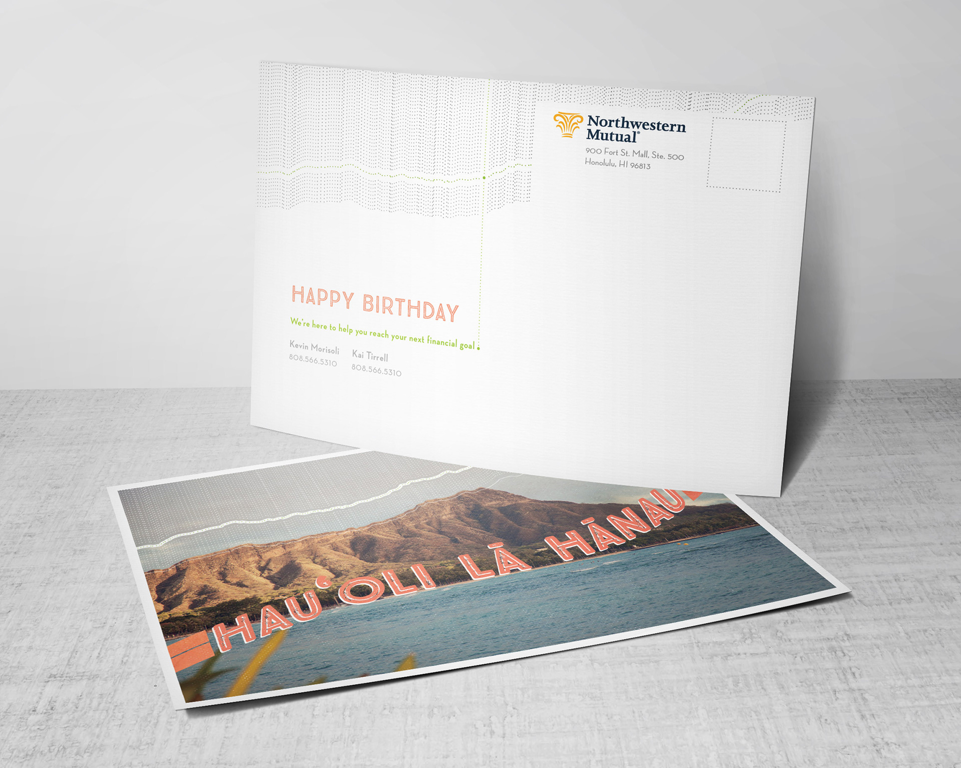 A client retention birthday mailer for the Northwestern Mutual Honolulu office. The birthday greeting is presented in the Hawaiian language, over a backdrop of the iconic landmark Diamond Head. The crater’s edge is echoed in a pattern above, which creates a design reminiscent of a financial line graph, to imply the prospect of financial growth. On the reverse side the pattern repeats with additional distinct elements—a subtext on translation, as well as link between the visual metaphor and ad copy.